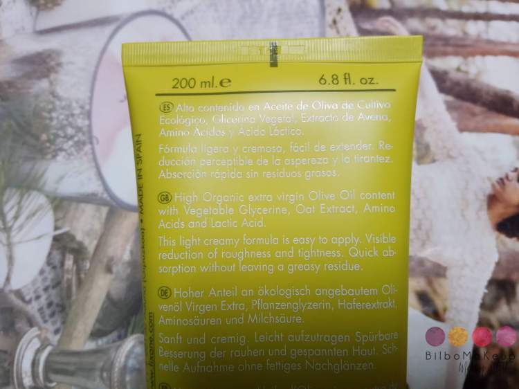 Esta leche corporal tiene un alto contenido en Aceite de Oliva de cultivo ecológico, glicerina vegetal, extracto de avena, amino ácidos y ácido láctico.
